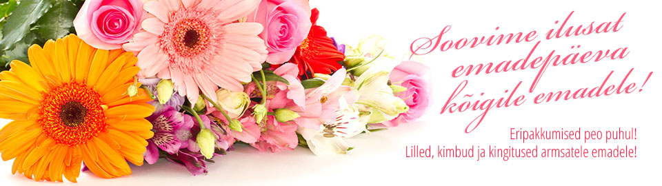 Мы осуществляем прямые поставки качественных и уникальных сортов роз, гвоздик, хризантем, тюльпанов, гербер и других цветов. Купить цветы можно как в нашем онлайн-магазине, так и в представительстве. Возможна доставка цветов и букетов на дом курьером в Таллинне, во всех городах Эстонии и даже зарубежом. Вы наверняка найдете то, что искали, в нашем широком выборе цветов для любого случая: простые срезанные цветы, растения в горшках, праздничные и свадебные букеты, комнатные растения, цветочные корзины, траурная флористика и т.д. Кроме цветов, мы также предлагаем большой выбор флористических принадлежностей и аксессуаров - различные упаковочные материалы для оформления букетов и подарков (ленты, пакеты, рафия, сизаль, лагурус, камыш, скелет-лист, корица, несколько десятков видов птичек, бабочек и пчелок для украшения букетов), флористическая губка и т.п. Также в постоянной продаже декоративные цветочные горшки и несколько типов земли и специальных удобрений.